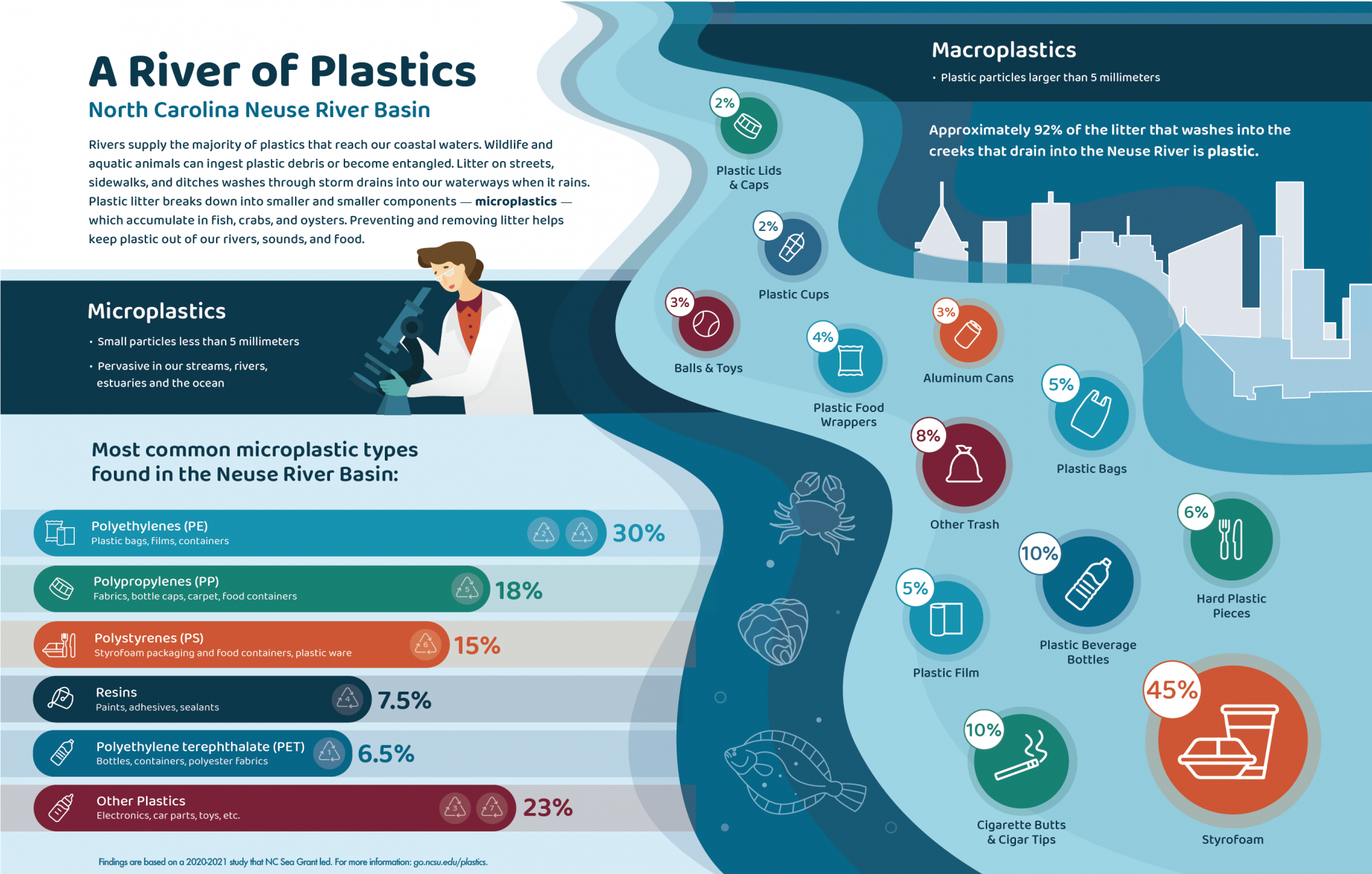 Rivers supply most of the plastics in coastal environments, which can have adverse impacts. Birds and marine mammals can consume or become entangled in debris. Larger plastics can obstruct an animal’s digestive tract, eventually even leading to death. Chemicals on surface plastic also can be toxic and accumulate up the food chain.